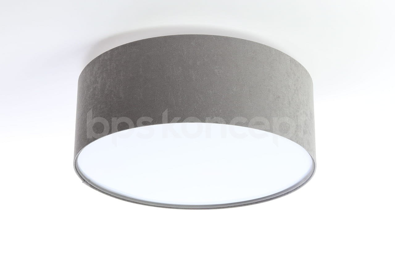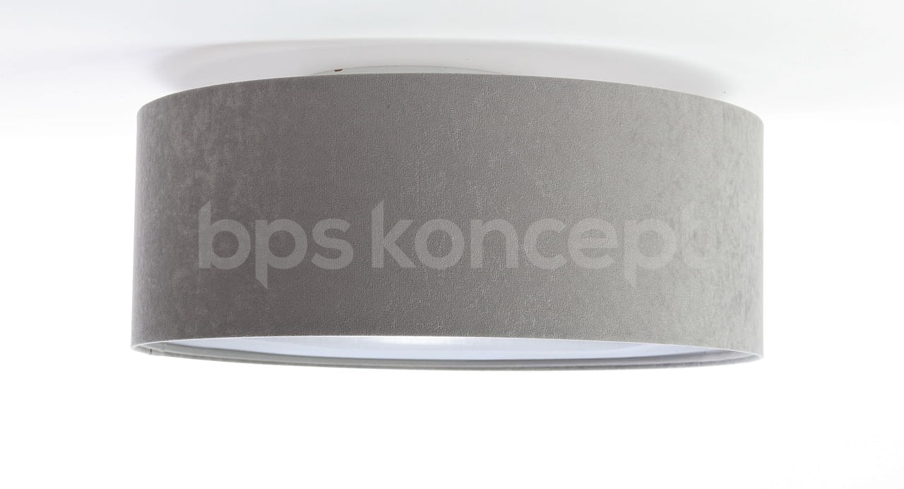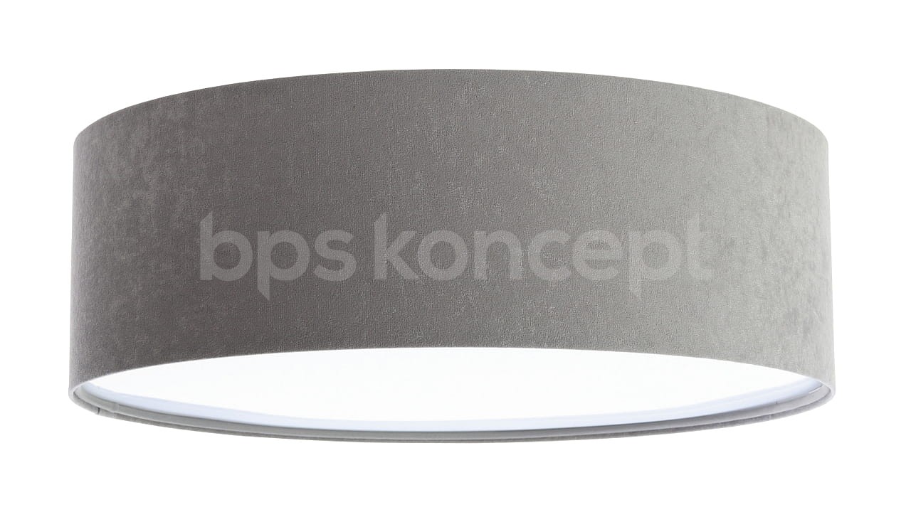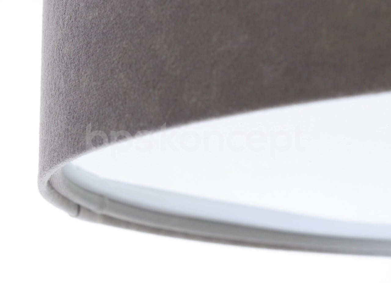 Plafon wykonany jest z białego plastiku, pokrytego szarą welurową tkaniną. Posiada blendę maskującą w kolorze opal białym, która jest bardzo łatwa do demontażu i umycia pod bieżącą wodą. Lampa wyposażona jest w oprawy na 2 żarówki. Abażur jest odporny na działania promieni UV - tkanina nie ulega blaknięciu w trakcie użytkowania. Lampa zrobiona jest ręcznie. Jest to w całości polska produkcja. Każdy produkt powstaje tuż przed wysyłką.
