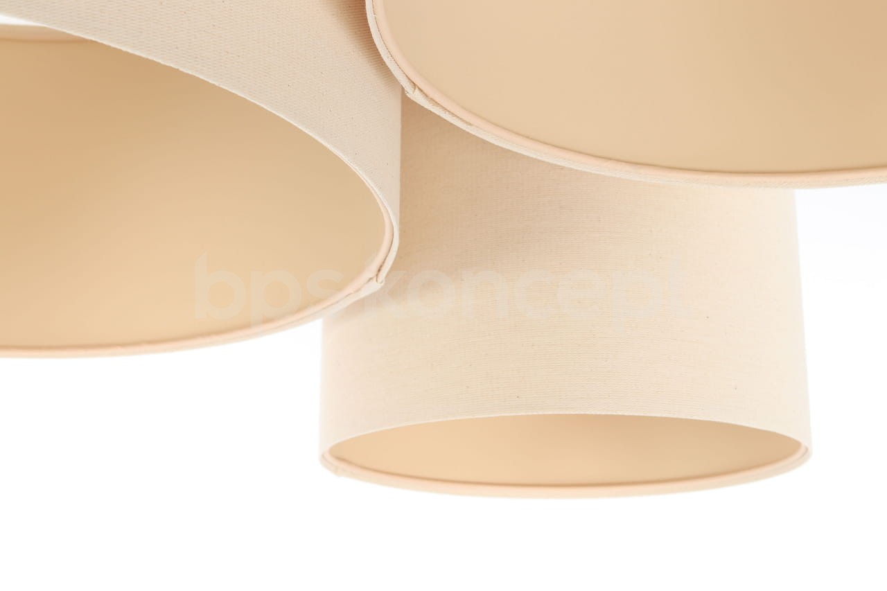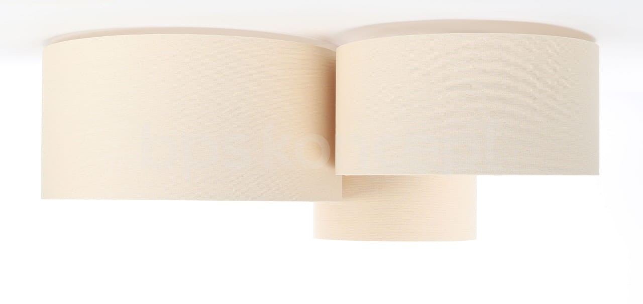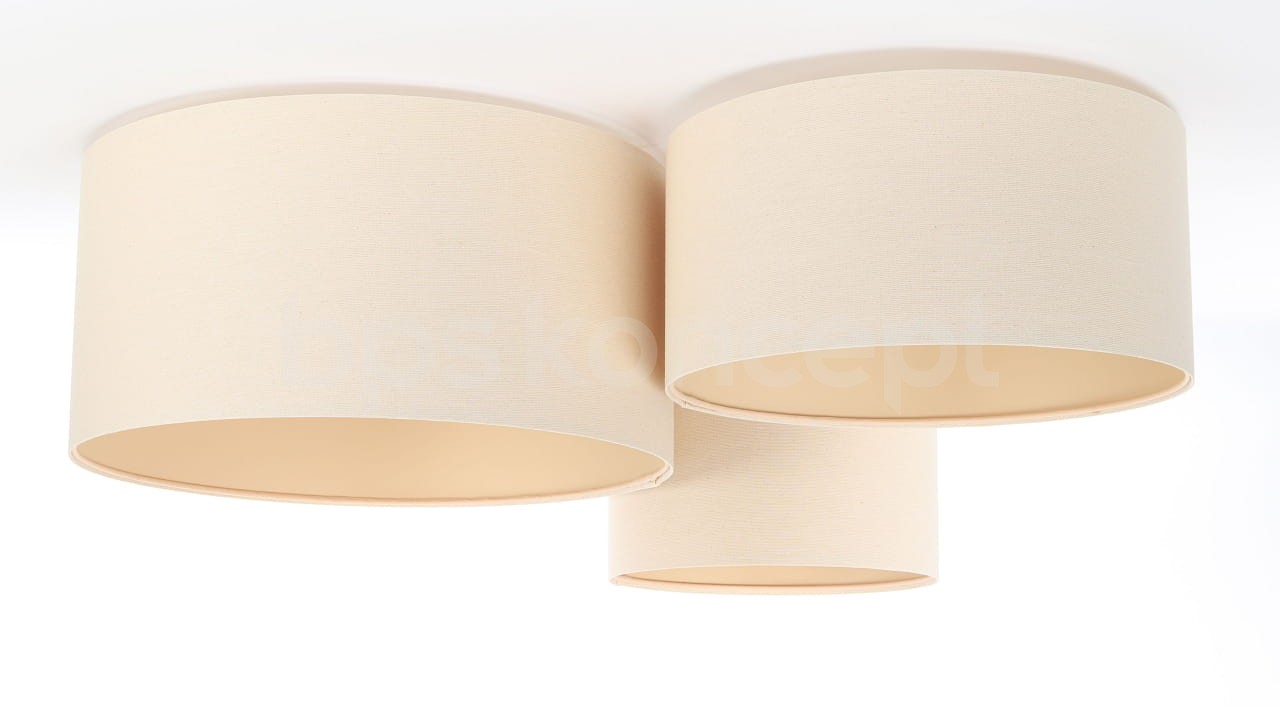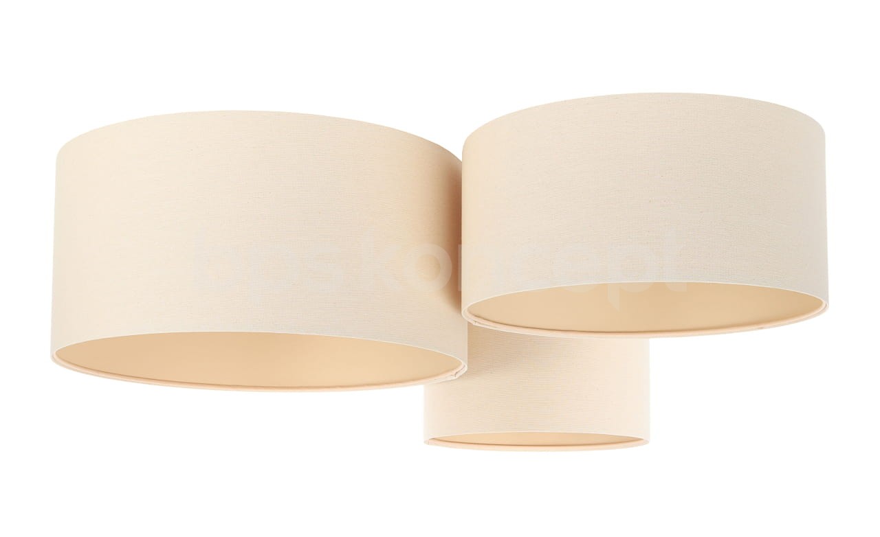 Lampa składa się z kombinacji trzech abażurów, każdy o innej średnicy i wysokości, co w połączeniu tworzy ciekawy układ. Abażur wykonany jest z naturalnej jutowej tkaniny nałożonej na plastiku PCV z kremowo-beżowym środkiem. Lampa doda elegancji i będzie stanowić piękny akcent dopełniający każdy wystrój wnętrz. Abażur jest odporny na działania promieni UV, dlatego tkanina nie ulega blaknięciu w trakcie użytkowania. Jest to w całości polska produkcja.