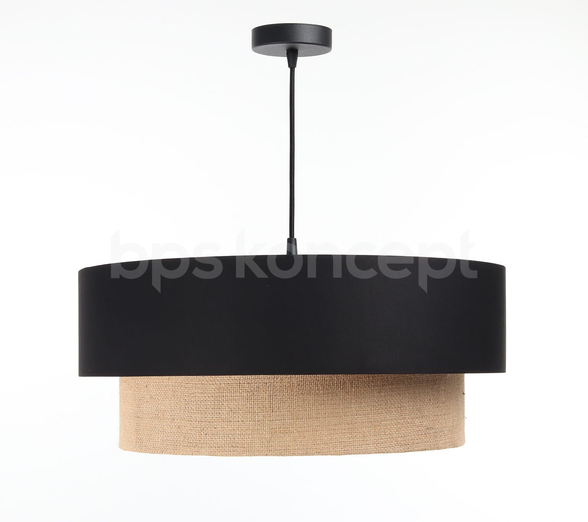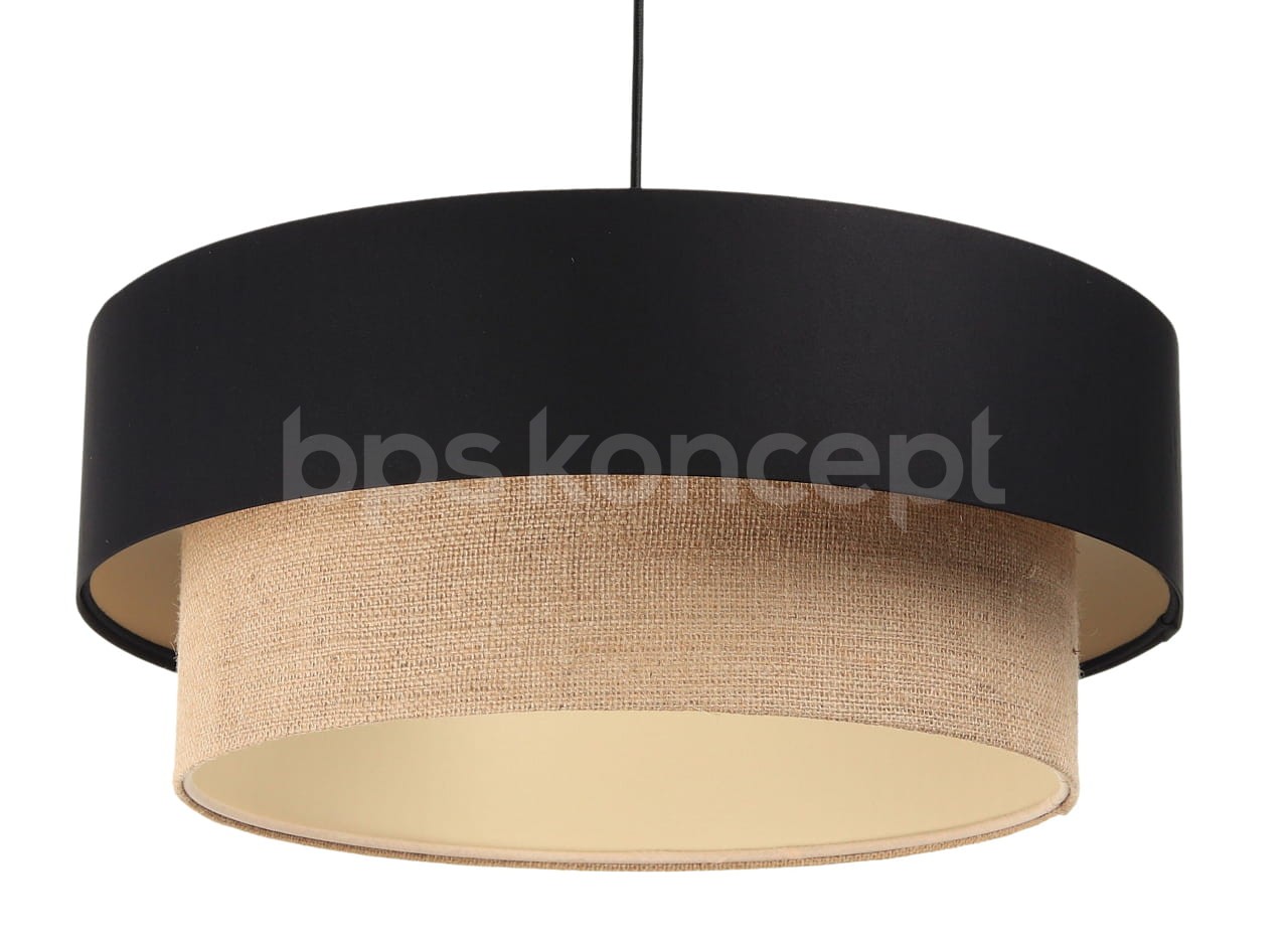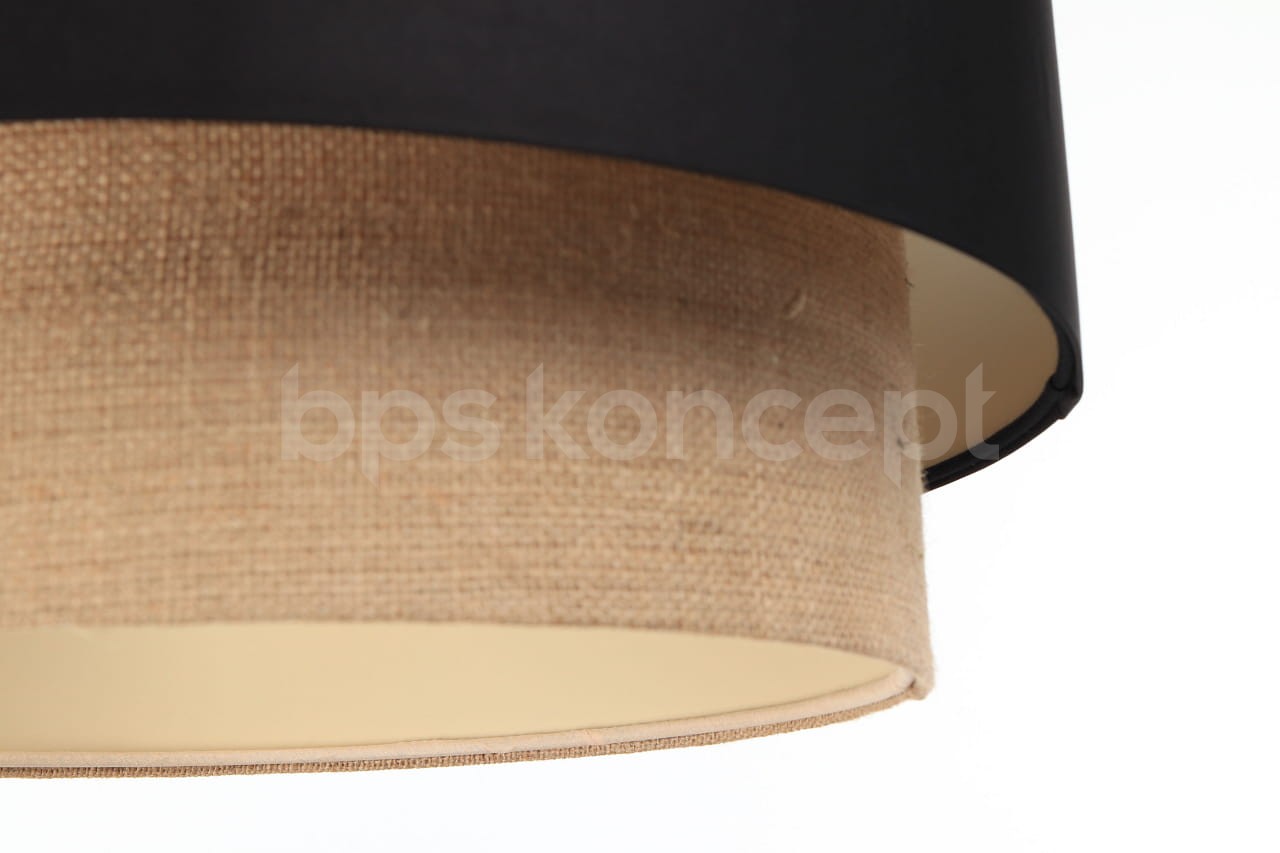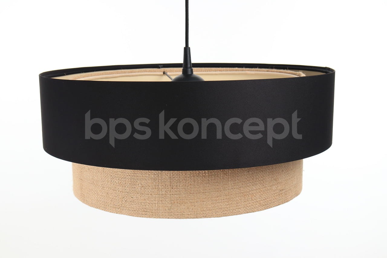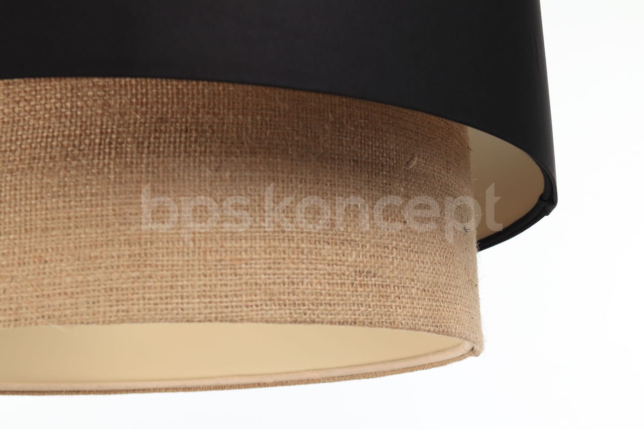 Abażur wykonany jest z naturalnej juty w połączeniu z czarną satyną, nałożone na plastiku PCV z kremowo-beżowym środkiem. Lampa doda elegancji i będzie stanowić piękny akcent dopełniający każdy wystrój wnętrz. Abażur jest odporny na działania promieni UV, dlatego tkanina nie ulega blaknięciu w trakcie użytkowania. Jest to w całości polska produkcja.
