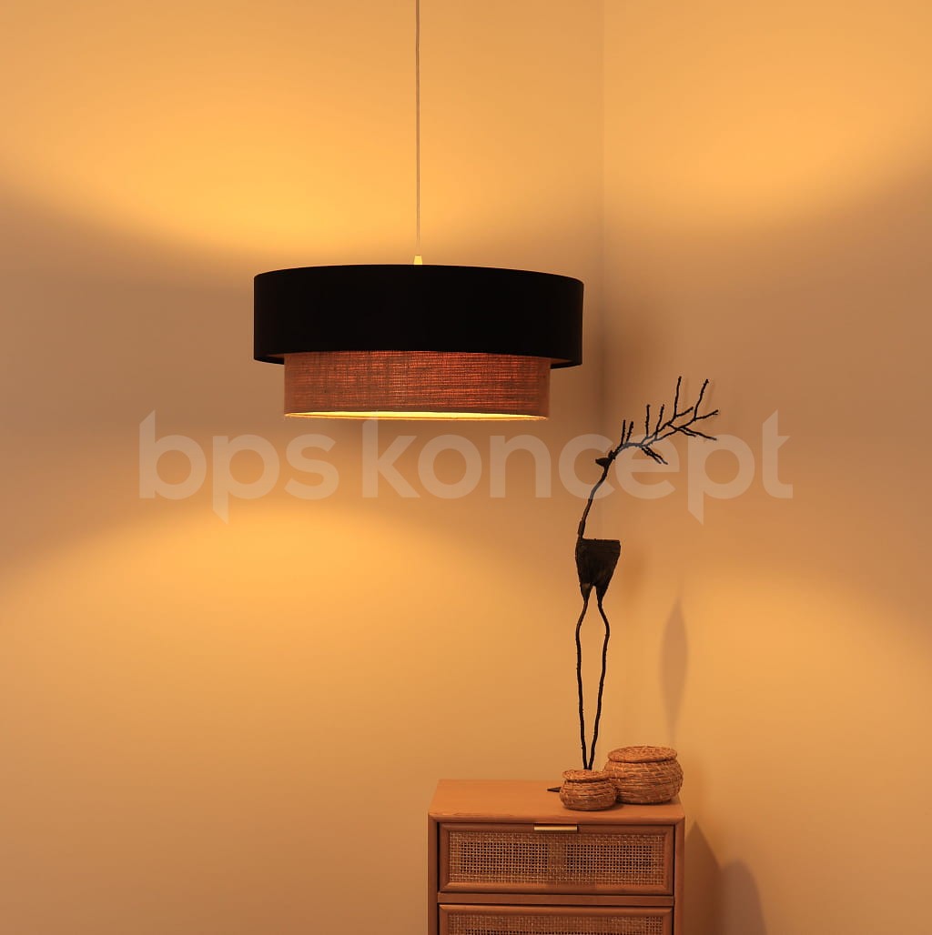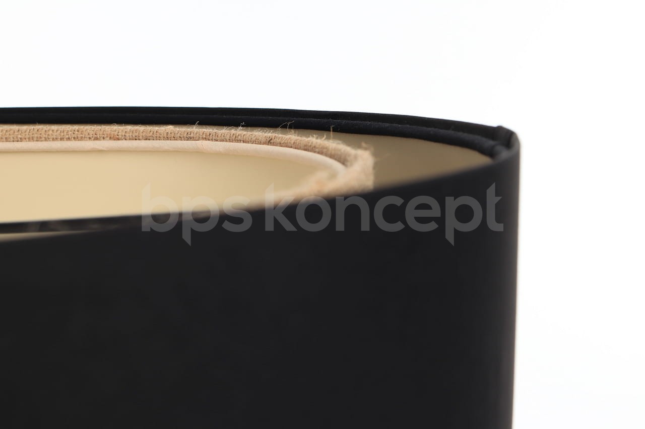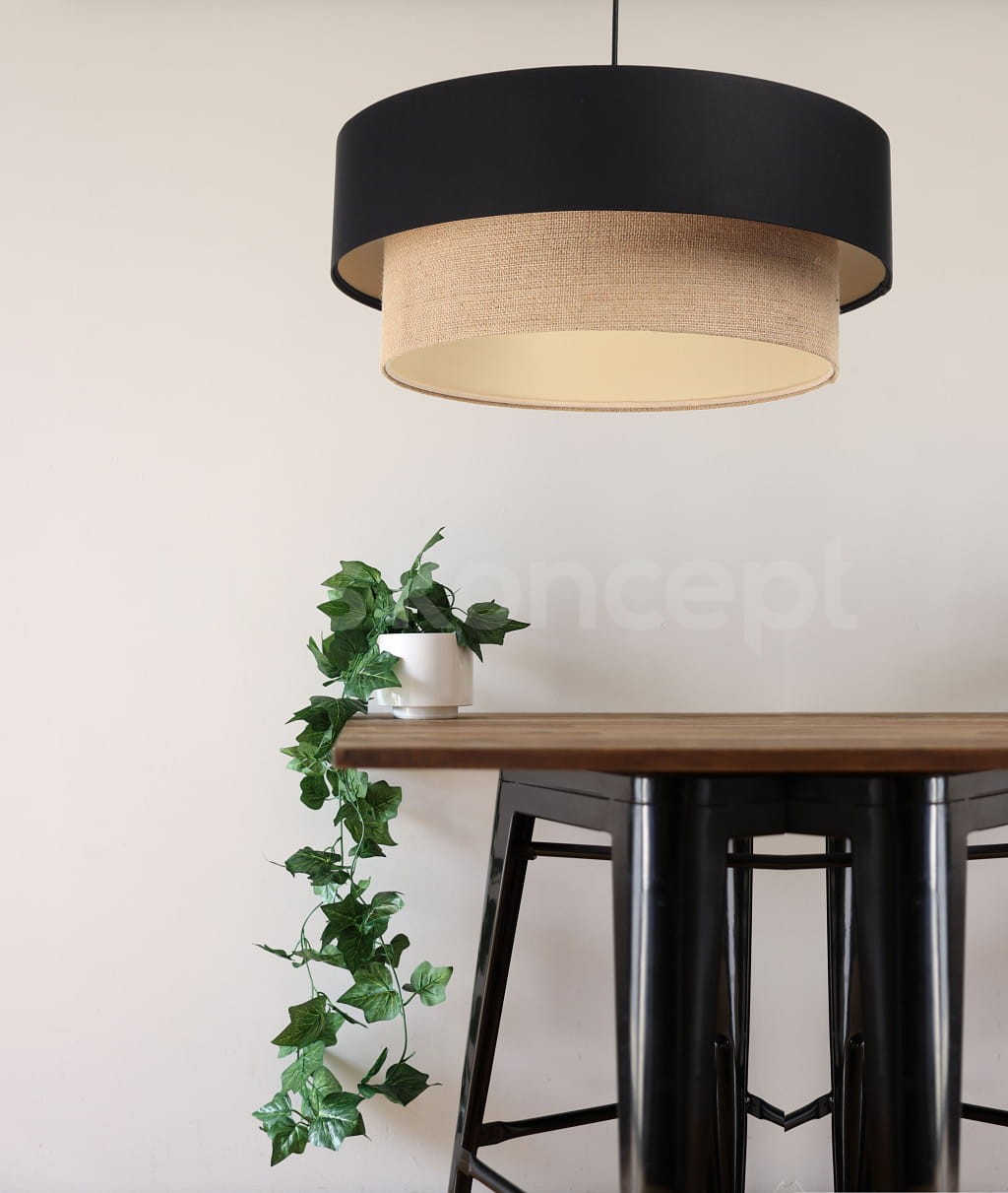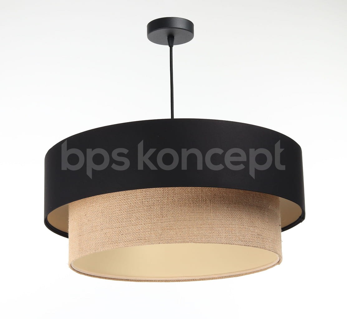 Abażur wykonany jest z naturalnej juty w połączeniu z czarną satyną, nałożone na plastiku PCV z kremowo-beżowym środkiem. Lampa doda elegancji i będzie stanowić piękny akcent dopełniający każdy wystrój wnętrz. Abażur jest odporny na działania promieni UV, dlatego tkanina nie ulega blaknięciu w trakcie użytkowania. Jest to w całości polska produkcja.