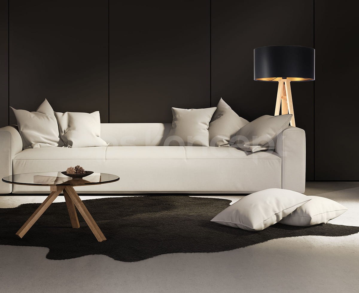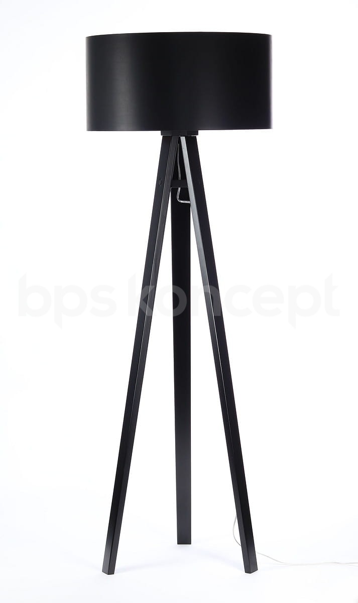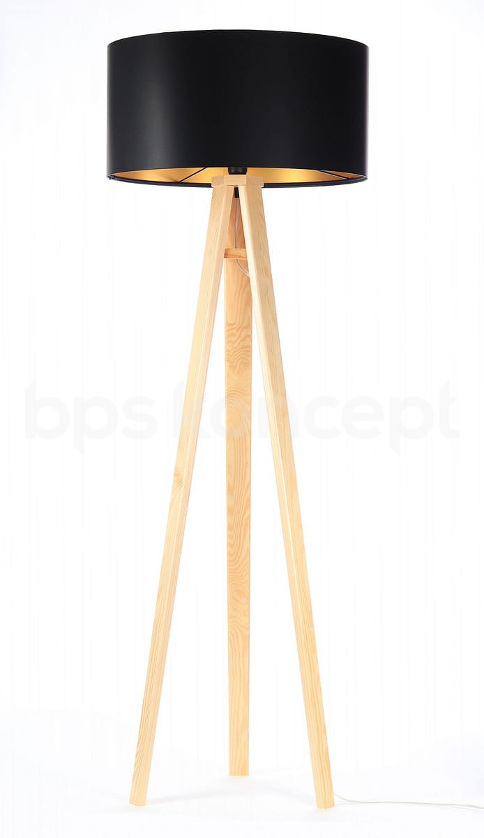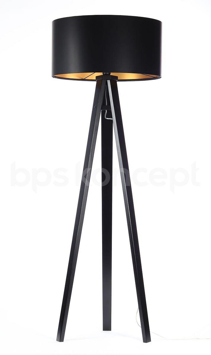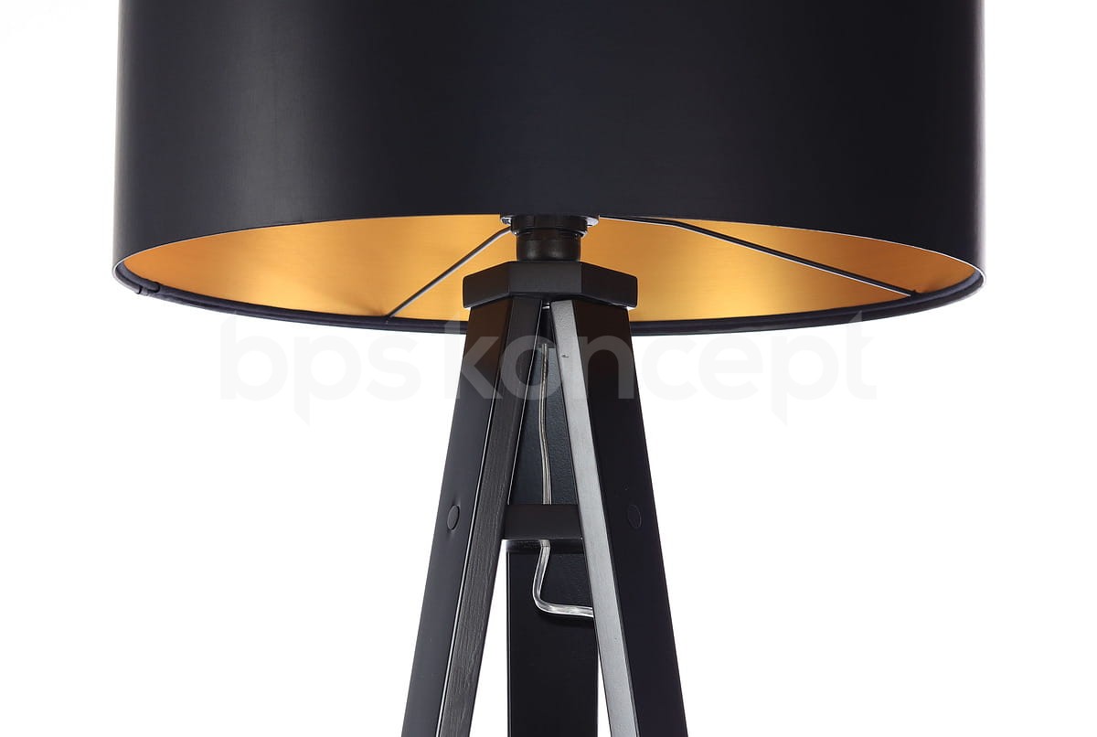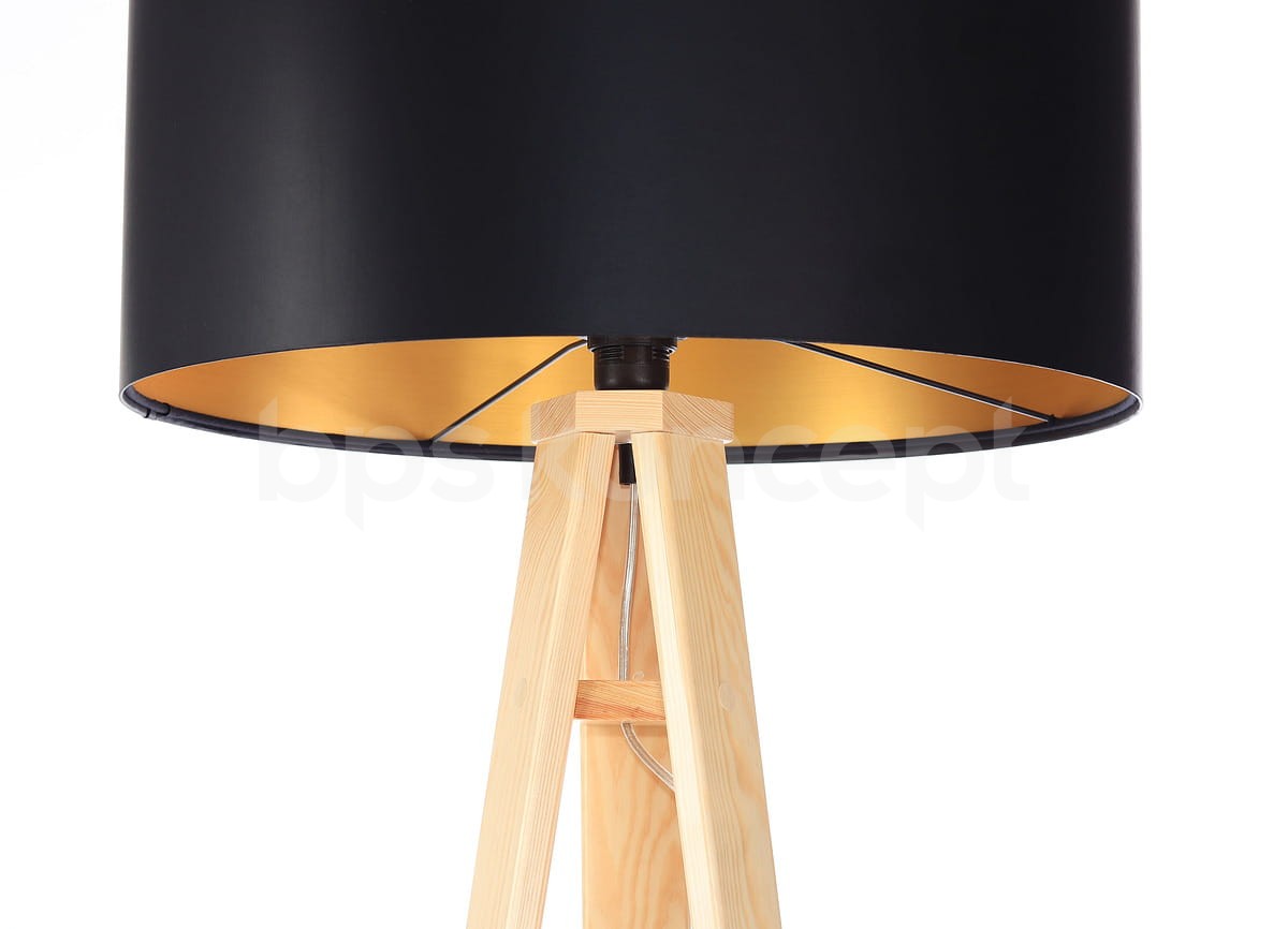 wykonany jest z tkaniny latexowej w kolorze czarnym o przepięknym, gładkim wykończeniu, wzbogaconym delikatnymi rysami. Wnętrze abażura to plastik PCV, pokryty wysokiej jakości złotą folią z efektem szczotkowanej satyny. Lampa doda elegancji i będzie stanowić piękny akcent dopełniający każdy wystrój wnętrz. Satynowe złoto w podświetleniu daje przepiękny poblask. Podstawa tej lampy do drewniany trójnóg w kolorze matowym czarnym. Abażur jest odporny na działania promieni UV, dlatego tkanina nie ulega blaknięciu w trakcie użytkowania. Abażur można wyczyścić z kurzu i zabrudzeń przy użyciu lekko zwilżonej ściereczki Lampa wyprodukowana jest ręcznie. Jest to w całości polska produkcja.